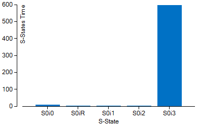 Graphical representation of the amount of time spent in each system sleep state (S-State). Hover over a bar to see the number of seconds the system spent in a specific sleep state. Switch to the System Sleep States sub-tab to view more detailed information about the time spent in each state. See Window: System Sleep States - Platform Power Analysis for more information.