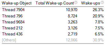 Identifies the objects that caused the cores to wake-up the most. Objects include system events such as a clock interrupt, or a particular thread. Switch to the Core Wake-ups sub-tab to view more detailed information about the number of core wake-ups and wake-up reasons. See Window: Core Wake-ups - Platform Power Analysis for more information.