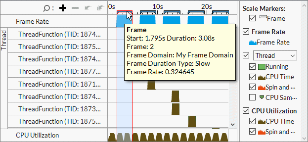 The Frame Rate band displays how the frame rate is changing over time. To understand the cause of the bottleneck, identify sections with the Slow or Fast frame types and analyze the CPU Utilization data. For example, you may detect the Slow frame rate for the section with the poor CPU utilization or thread contention. In this case, you may parallelize the code to utilize CPU resources more effectively or optimize the thread management.