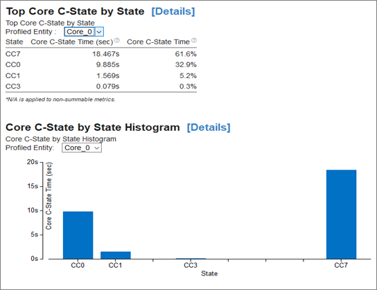 For example, this Top Core C-State by State diagram shows that the core was awake for approximately 10 seconds of the total collection time (time in CC0 state). Use the Profiled Entity drop-down to view the C-state data for other cores. Explore the histogram to analyze the time spent in each sleep state.