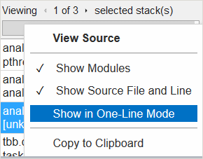 Context menu. Manage the call stack representation in the Call Stack pane (applicable to all stacks). Right-click and select an option. For example, you may de-select the Show in One-Line Mode option to view functions in two lines: