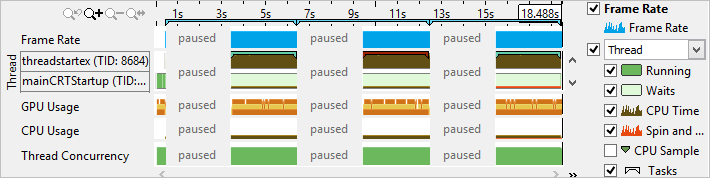 When the data collection is complete, the VTune Profiler displays paused regions in the Timeline pane as follows: