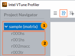 To access this pane: Click the Project Navigator icon on the Intel® VTune™ Profiler toolbar in the standalone graphical interface. To manage VTune Profiler projects/results from the Microsoft Visual Studio* IDE, use the Solution Explorer functionality.