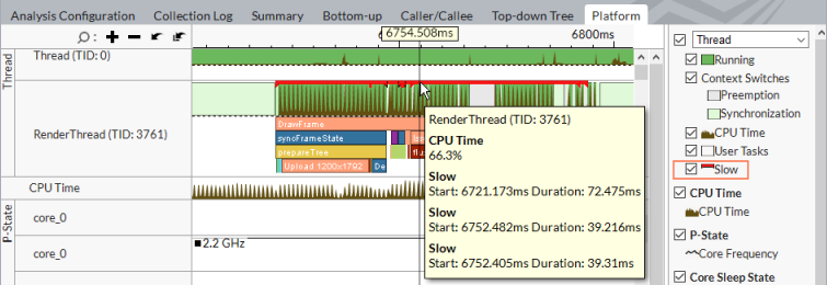 For Ftrace/Atrace tasks, the Platform view provides an option to enable Slow Tasks markers and explore the CPU utilization, GPU usage and power consumption at the moment of slow tasks execution: