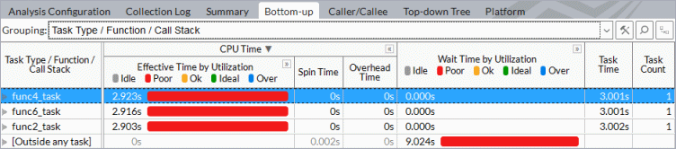Click a task type in the Top Tasks section to switch to the grid view (for example, Bottom-up or Event Count) grouped by the Task Type granularity. The task selected in the Summary window is highlighted. For example, for ITT API tasks collected during the Threading analysis the Bottom-up grid view is grouped by Task Type/Function/Call Stack: