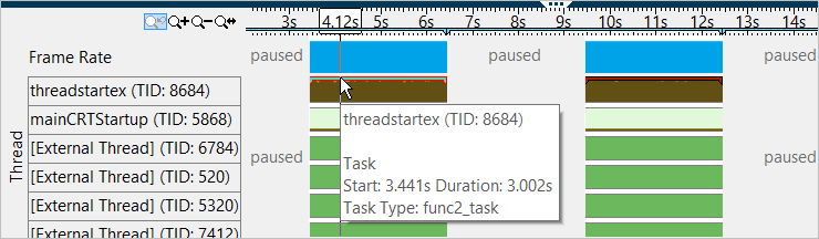 User tasks are shown on the timeline with yellow markers. Hover over a task marker for task execution details. In the example above, the func2_task started at the 3.4th second of the application execution on the thread threadstartex (TID: 8684) and lasted for 3.002 seconds.