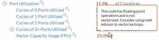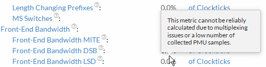 Grayed out metric values indicate that the data collected for this metric is unreliable. This may happen, for example, if the number of samples collected for PMU events is too low. In this case, when you hover over such an unreliable metric value, the VTune Profiler displays a message: