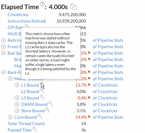In the example above, mousing over the L1 Bound metric displays the metric description in the tooltip.