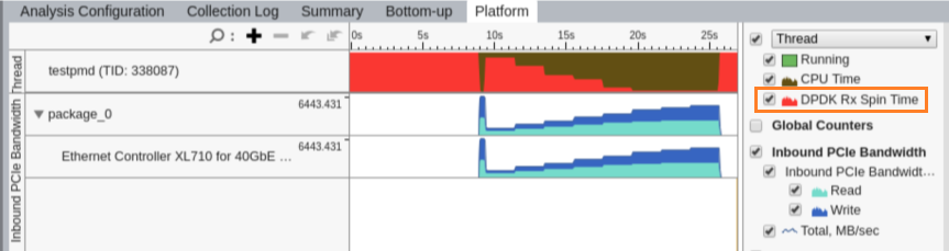 Use the Platform tab to explore the DPDK Rx Spin Time metric on the timeline at per-thread basis: