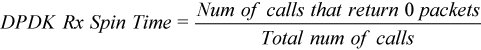 The DPDK Rx Spin Time metric shows the ratio of polling cycles fetching no packets, or the number rte_eth_rx_burst() calls that returned zero packets, to the total number of polling loop cycles: