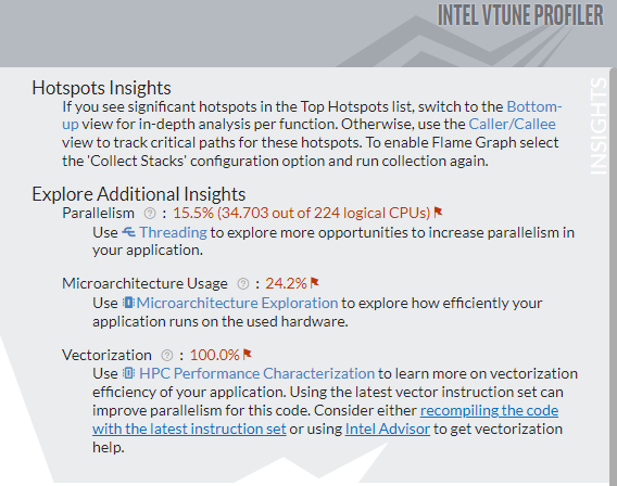 If you ran the analysis with the default Show additional performance insights option, the Summary view will include the Insights section that provides additional metrics for your target such as efficiency of the hardware usage and vectorization. This information helps you identify potential next steps for your performance analysis and understand where you could focus your optimization efforts.