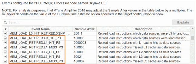 Check the HOW configuration pane in the Configure Analysis window to make sure the events you use are precise. Usually precise events have a _PS postfix (for example, MEM_LOAD_RETIRED.FB_HIT_PS) in the Description column as follows: