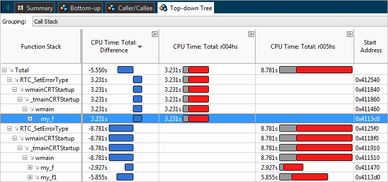 For example, your binary with a my_f function was modified with adding a new function my_f1 and new calls of this function. As a result, my_f address has changed. If you compare the results before and after the modification using the default Call Stack grouping, the VTune Profiler treats the same functions with different addresses as separate instances and does not compare them: