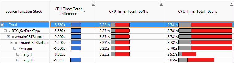 By default, the VTune Profiler displays compared functions grouped by the Call Stack granularity, which is based on function instances. But you may want to switch to the Source Function Stack grouping to get more accurate comparison results in the following cases: