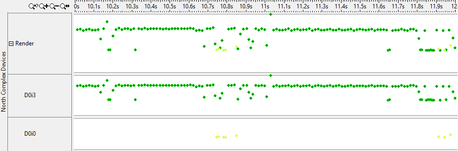 The Timeline pane displays the D0ix states of each device at each point when the data was read. Each state is shown in a different color. Use the legend on the right to add or remove D0ix states from the timeline. Hover over a data point to see the percentage of time spent in each state. Zoom in or out on the timeline to view trends in more detail. Filters applied on a timeline in one window are applied on all other windows within the viewpoint. This is useful if you identify an issue on one tab and want to see how the issue impacts the metrics shown on a different tab. The following example shows a zoomed-in view of the result above to show individual data points.