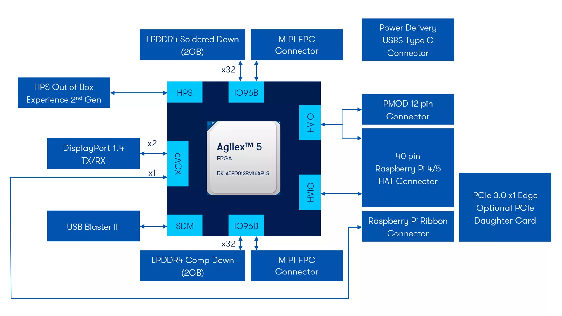 Agilex™ 5 FPGA E-Series 013B Dev Kit delivers a complete prototyping and reference platform design environment that includes both hardware and software. It is a general-purpose evaluation board in a table top form factor with HPS hardware features enabling you to develop industrial, video, and other embedded and edge applications. It is upgradable to PCIe Form Factor with an optional PCIe Daughter card.