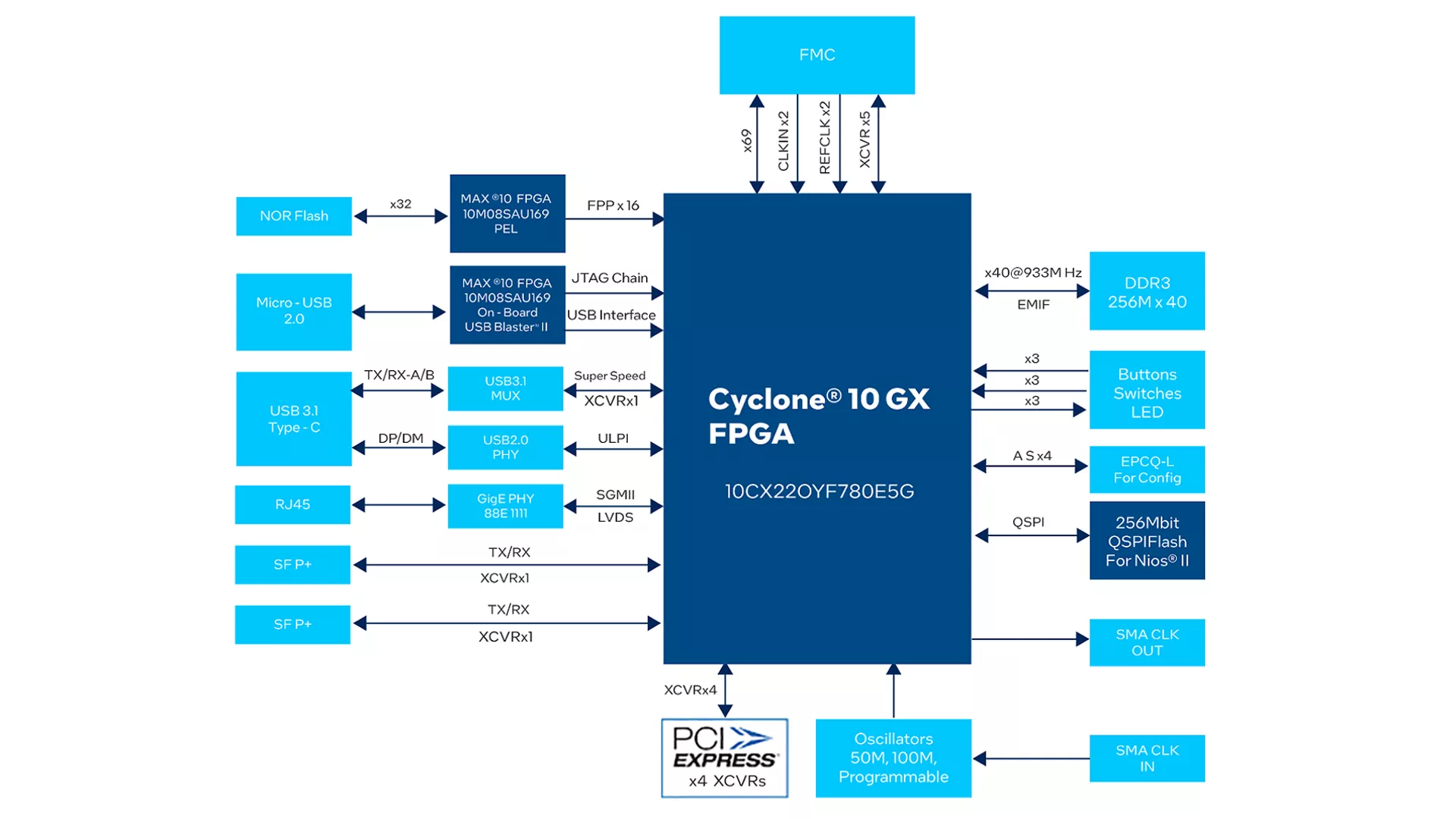 The Cyclone® 10 GX FPGA Development Kit is an ideal starting point for applications, such as embedded vision, factory automation, video connectivity evaluation, or concept proving.
