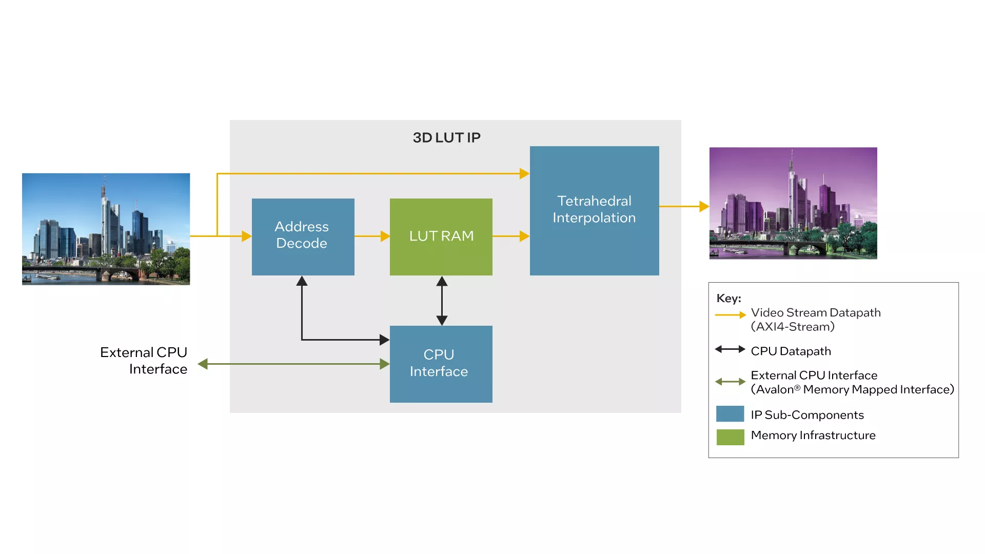 As a part of the Video and Vision Processing (VVP) Suite Intel® FPGA IP, the 3D look-up table (LUT) Intel® FPGA IP provides an efficient solution for video color space and dynamic range conversions, chroma keying, and the creation of artistic effects.