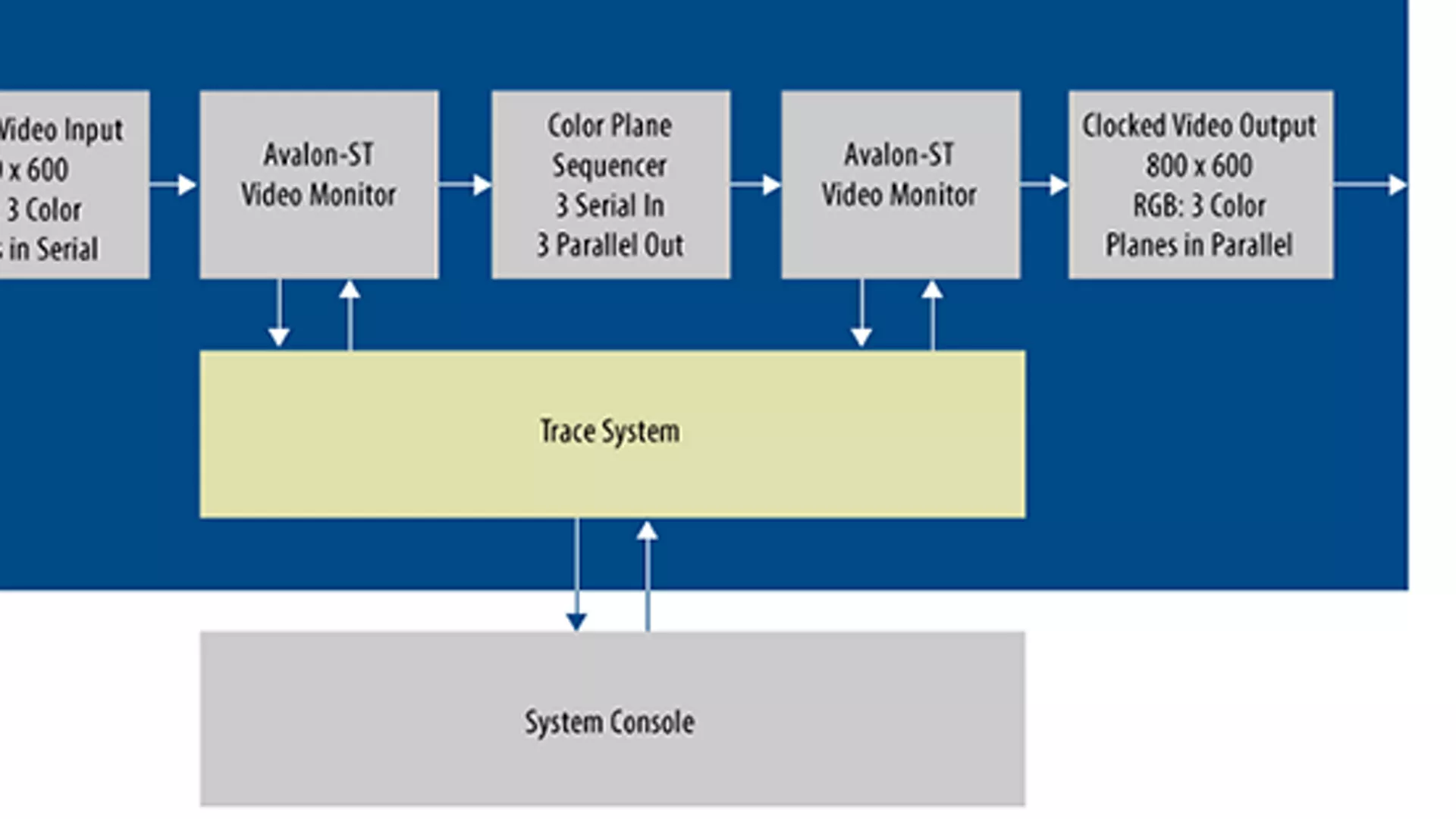 The Avalon-ST Video Monitor is a core that can be inserted in series with your video datapath that reads Avalon-ST video packet information and provides diagnostic data to the Trace System. The Video Monitor is inserted where you want to probe the video datapath for analysis and statistics information. When combined with the Trace System core and connected externally through a debug port such as JTAG or through an Intel FPGA Download Cable, you can get greater visibility into the video system's behavior. You can use System Console as the virtual platform to display this information.