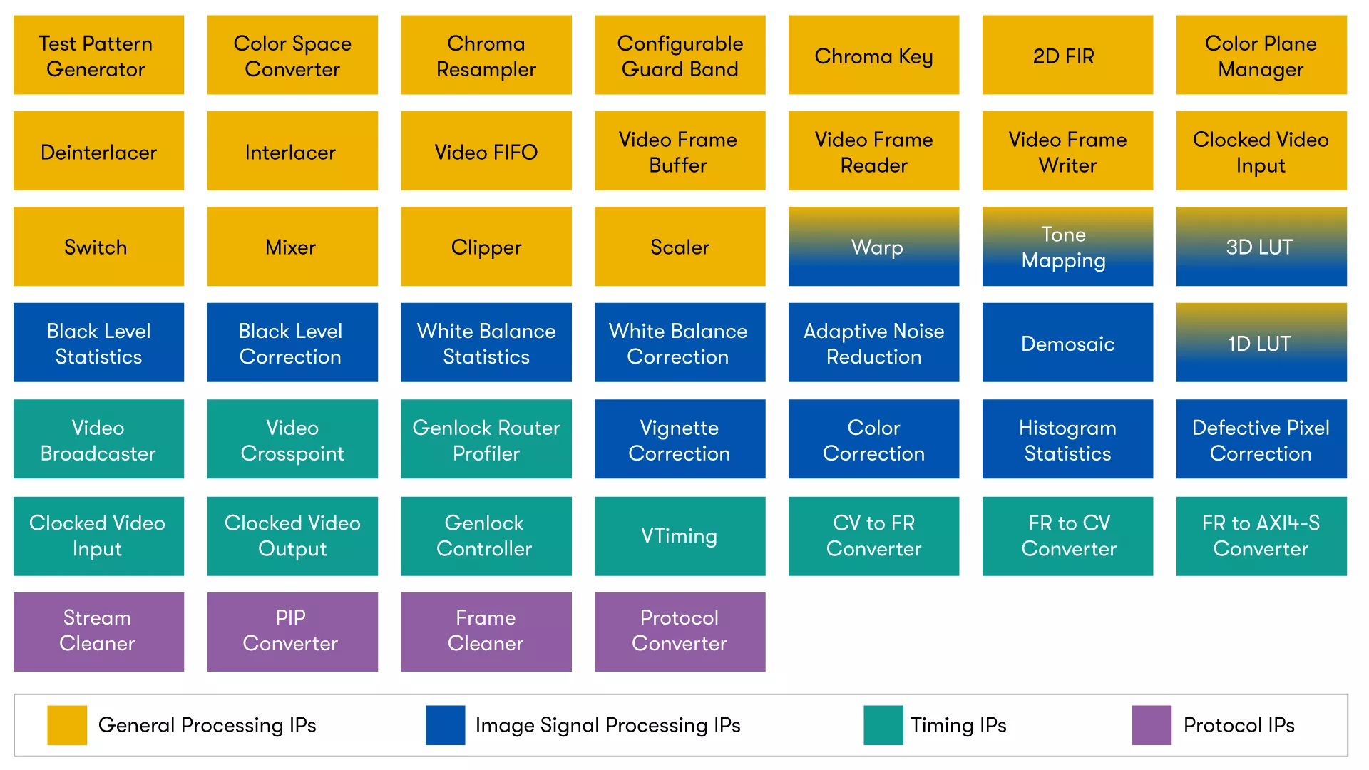 The Clocked Video Interface IPs convert clocked video formats (such as BT656, BT1120, and DVI) to AXI4-Streaming video; and vice versa.