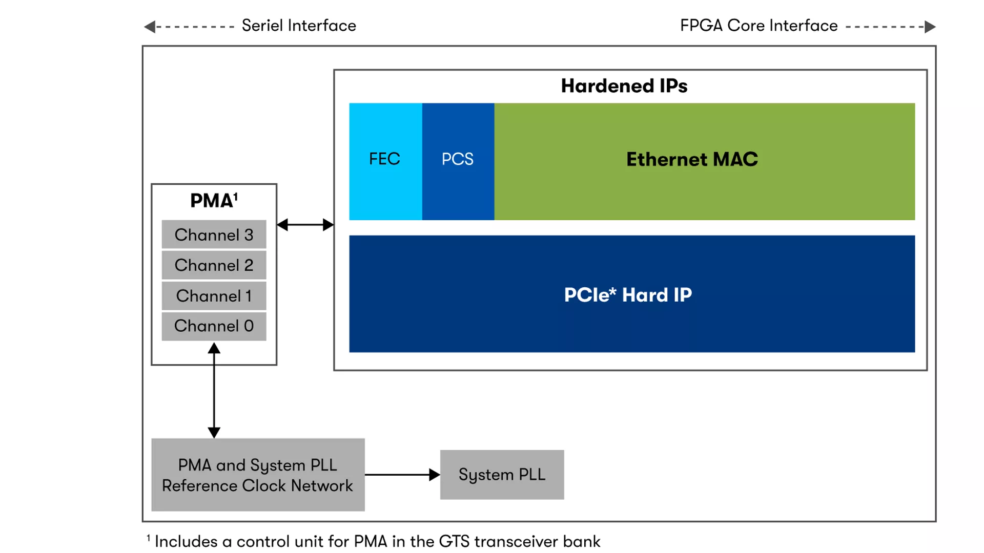 - Hardened PCS—supports 64b/66b encoding and decoding functions, data scrambling, block alignment, and gear boxing functions.