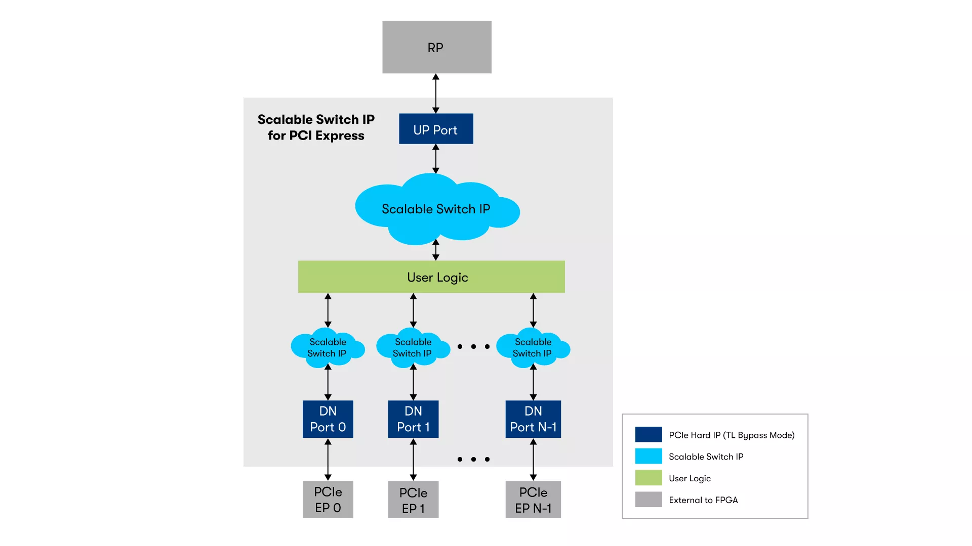 The Scalable Switch Intel® FPGA IP for PCI Express is a fully configurable switch that implements one fully configurable upstream port and connectivity for up to 64 downstream ports.