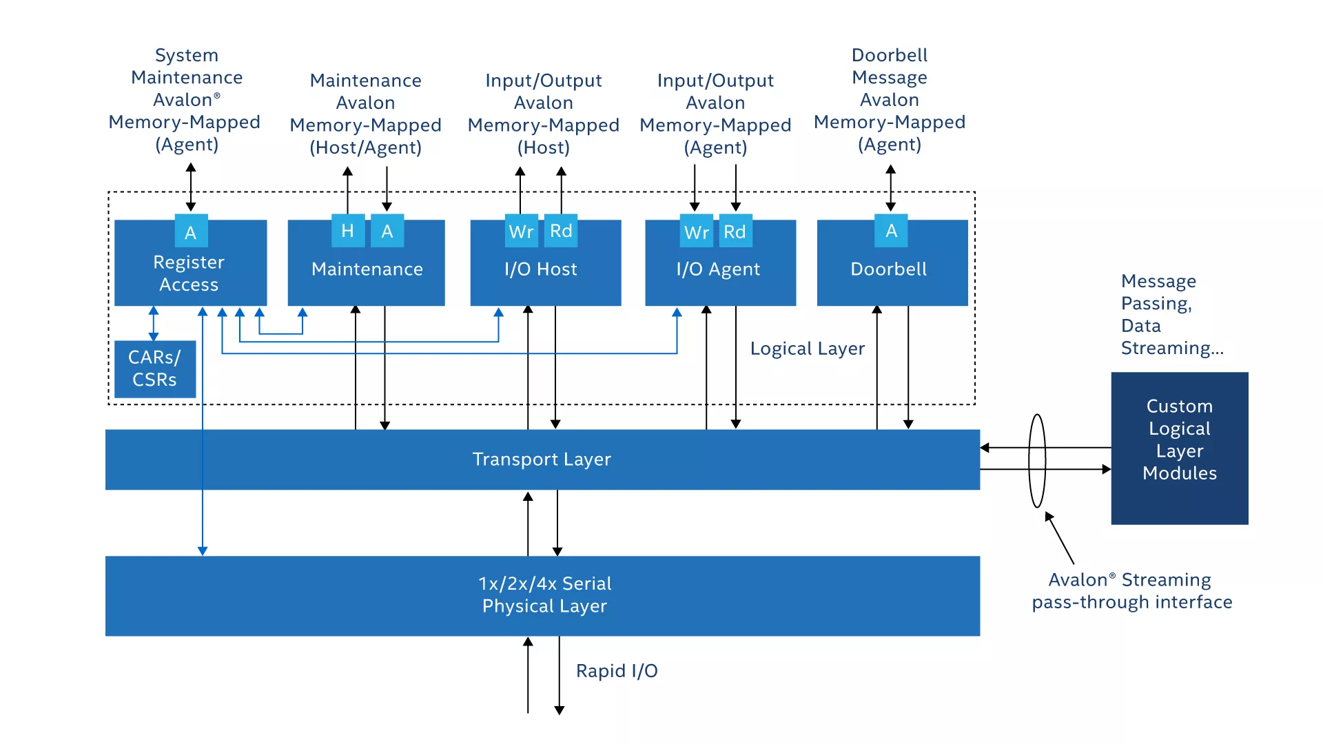For a system-level integration-ready solution, you can save several months of design time by selecting all RapidIO layers—including features, such as address translation as well as simple Avalon® Memory-Mapped (Avalon-MM) and Avalon® Streaming (Avalon-ST) FIFO interfaces.