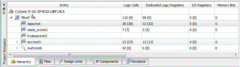 Columns in the Hierarchy tab list resources used by the design entity (including the design entity) and the number of resources (in parentheses) instantiated by the design entity at that level in the hierarchy.