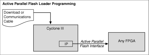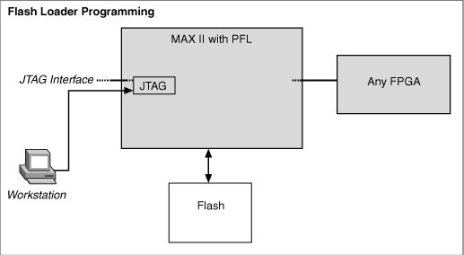 High-density FPGA devices require more configuration storage from a parallel flash loader. The MAX II Parallel Flash Loader feature in MAX II devices provides an easy way to program CFI flash memory devices through the JTAG interface, and the logic to control configuration from the flash memory device to the FPGA device.