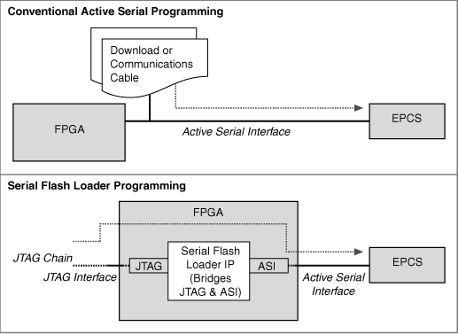 You can use flash loaders to program Altera devices. The Serial Flash Loader scheme allows in-system programming of serial configuration devices. Because serial configuration devices do not support the JTAG interface, you should program them via the Active Serial programming interface. With the Active Serial programming interface, you use programming hardware to download the configuration data for programming serial configuration devices. However, with the Serial Flash Loader you can program serial configuration devices in-system via the JTAG interface. To do so, use an FPGA device as a bridge between the JTAG interface and the serial configuration device.