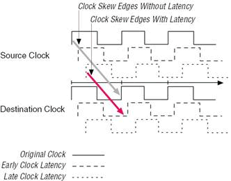 Specifies additional delay (that is, latency) in a clock network. This delay value represents the external delay from a virtual (or ideal) clock through the longest (-late) or shortest (-early) path, with reference to the rising (-rise) or falling (-fall) clock transition. For setup analysis, the TimeQuest analyzer uses the late clock latency for the data arrival path and the early clock latency for the clock arrival path. For hold analysis, the TimeQuest analyzer uses the early clock latency for the data arrival time and the late clock latency for the clock arrival time.