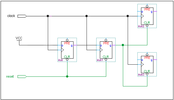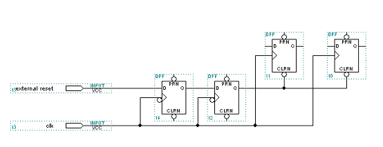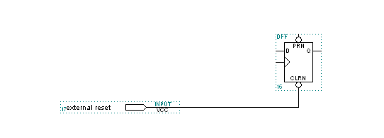 Asynchronous resets are permitted in circumstances where the reset can be released synchronously, most often through the use if of a synchronizer circuit. For example, if your design feeds the reset signal from the cascaded register on the active low CLR port, the D port of the first cascaded synchronizing register must feed the VCC port. The cascaded registers and the reset registers that are fed from the second register in the cascade should all have the same clock source. The following image is an example of an asynchronous synchronizing reset: