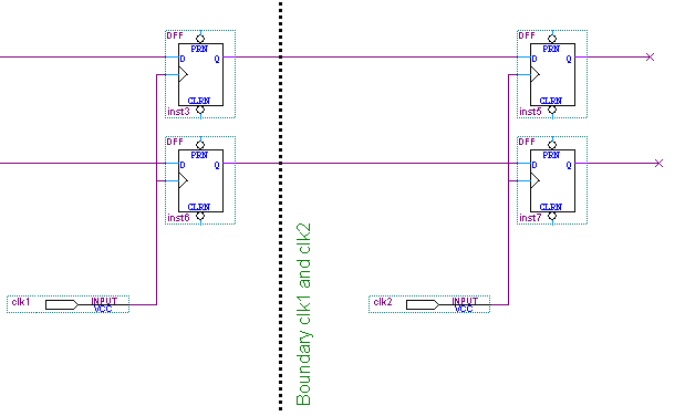 The following image shows an example of data bits that are transferred between asynchronous clock domains that are not synchronized: