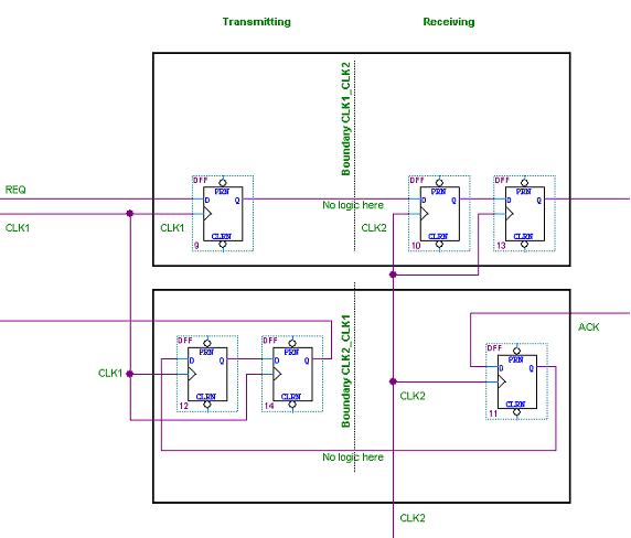 The following image shows an example of the transfer of data bits between asynchronous clock domains where only the REQ and ACK signals are synchronized: