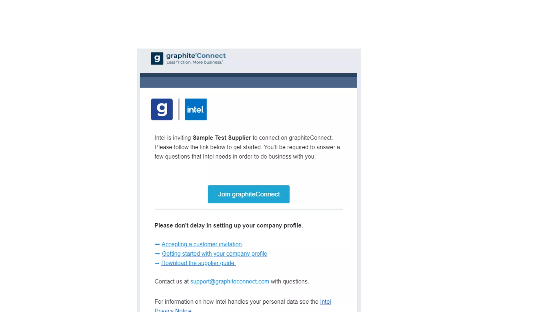 From November 2023 through 2024, Intel Suppliers can expect to receive an invitation (pictured on the right) to join Graphite Connect. Suppliers should not register for Graphite Connect until they receive an invitation.