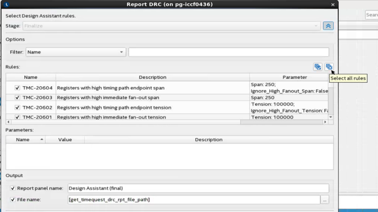 Due to a GUI problem in the Intel® Quartus® Prime Pro Edition software version 19.3 and earlier, you may see the wrong tool tip “Select all rules” when you double-click Report DRC under the Design Assistant folder in the Tasks pane of Timing Analyzer to open the Report DRC dialog box and move the mouse to the Deselect all rules icon.