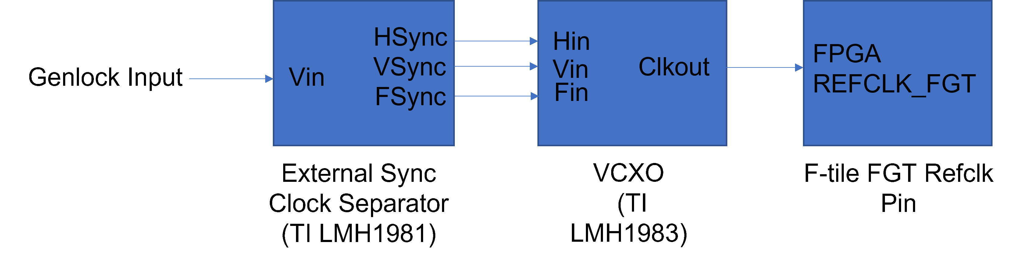 2. Use an external sync clock separator chip such as the TI LMH1981, to generate the FVH timing signal and feed the signals to the external VCXO (TI LMH1983) as shown in Figure 1. The TI LMH1981 external clock separator is available on the Nextera and Terasic 12G SDI-FMC daughter card and user has to supply the genlock input to the TI LMH1981 accordingly.