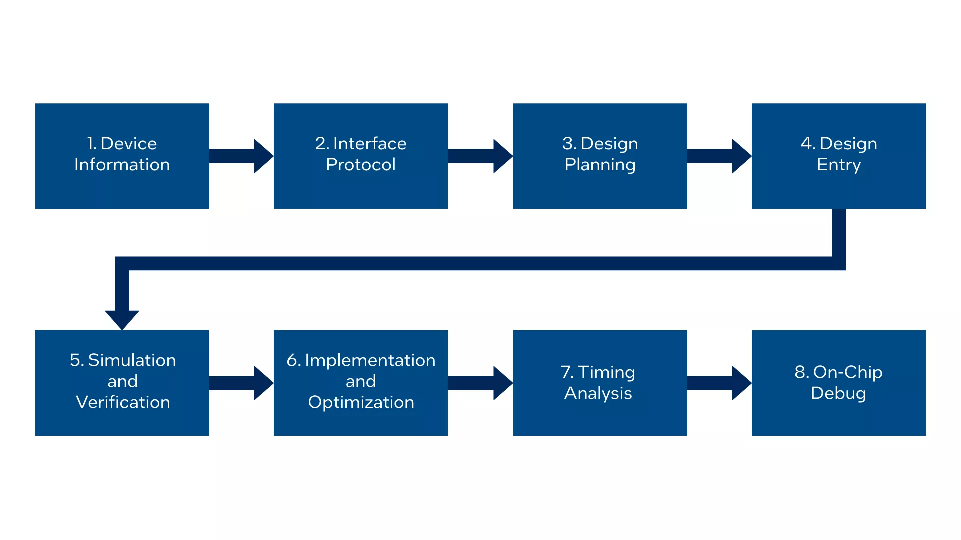 The FPGA Developer Center is organized into industry-standard stages, which provides you with various resources to complete your FPGA design. Each design step is detailed in the expandable sub-sections with links that allow you to select and move between the various Generation 10 device series.