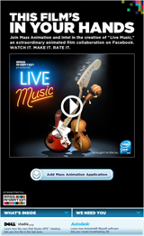 "Mass Animation's first project, 'Live Music' is a great story that we are excited to tell through a breakthrough Facebook application," Landau said. "This new method of creating films draws upon a global community and social technology to allow people to come together in a whole new type of creative collaboration. Animators around the world will get a chance to showcase their talent and imagination in the film; animation fans will have a say in which shots best convey the story and characters, and therefore deserve to make the final cut."