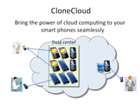 Smartphones and emerging Mobile Internet Devices (MIDs) are giving us access to more and more of our computing applications on-the-go. As this trend continues alongside a revolution in visual computing on the desktop, people will want the same immersive experiences on their mobile devices that they get on their PC. Intel's Clone Cloud research aims to make it possible to execute rich applications on resource-constrained mobile devices by off-loading computation to available cloud resources in nearby datacenters. The idea is to "clone" the entire set of data applications from the mobile device onto the cloud and selectively execute some operations on the clones, reintegrating results back to the mobile device. Intel's research also seeks to make sure that as this is done, the system remains secure in the face of adversity, protects the privacy of sensitive data, and ensures critical operations are only performed by those who are authorized and that service is consistently reliable. See Clone Cloud video and Intel Research Berkeley Lab web page for more information.