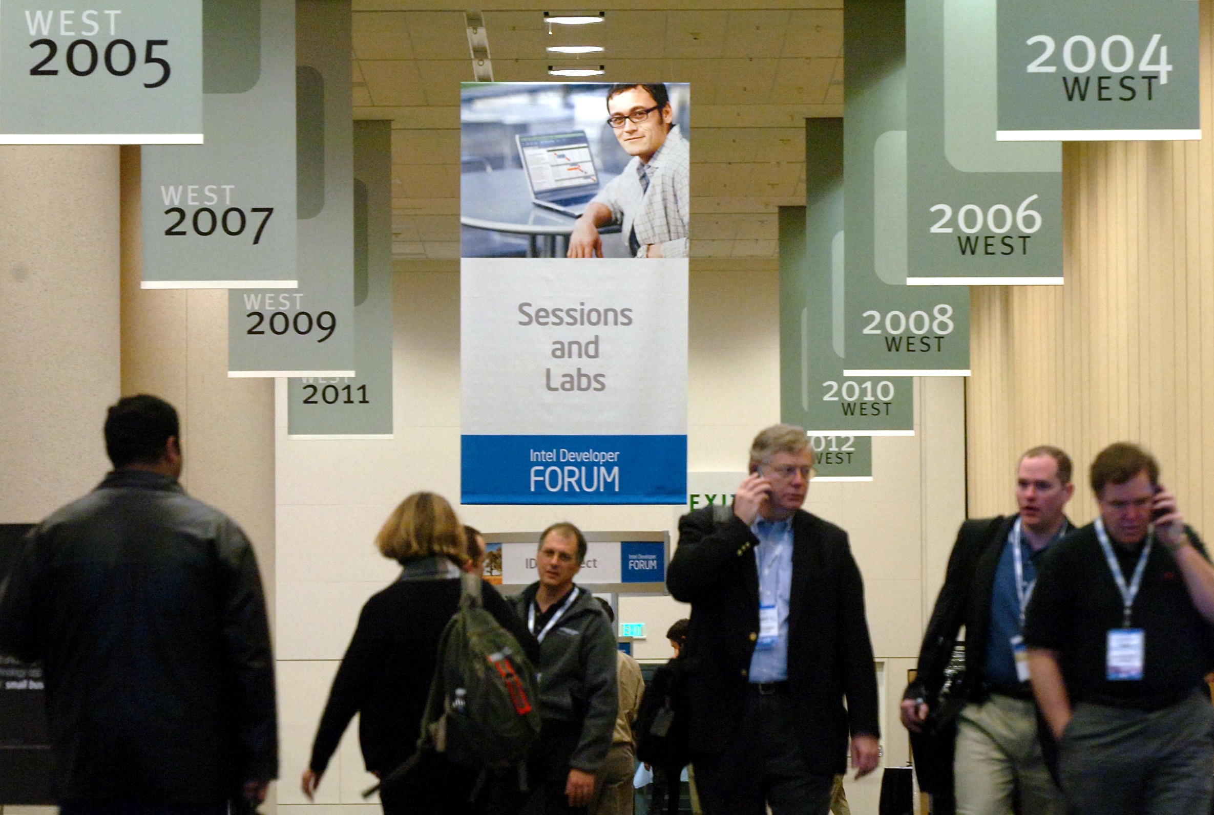 IDF attendees come and go as they take advantage of the Sessions and Labs at the Intel Developer Forum at Moscone West on Wednesday, March 8, 2006 in San Francisco, Calif. |