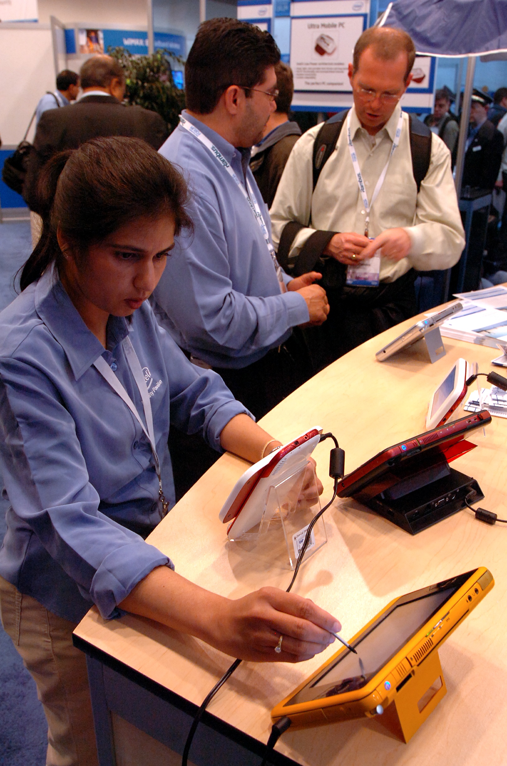 Meenakshi Gupta, Intel sponsor/exhibitor booth staff, checks the performance of ultra mobile PCs at the Intel Mobility Pavilion during the IDF Technology Showcase at the Intel Developer Forum at Moscone West on Wednesday, March 8, 2006 in San Francisco, Calif. |