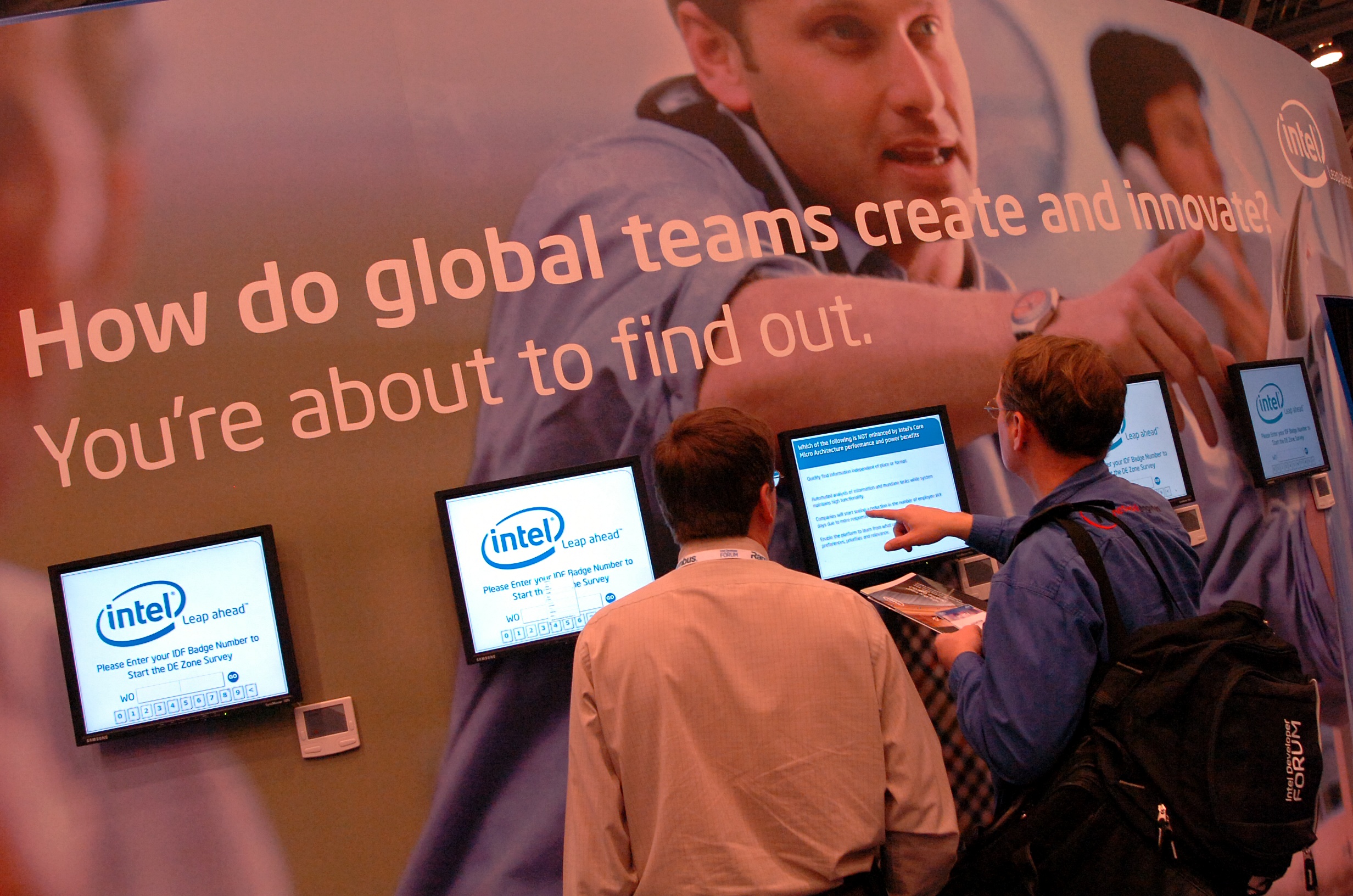 IDF attendees enter their badge numbers to start the DE Zone Survey at the Intel Digital Enterprise Pavilion during the IDF Technology Showcase at the Intel Developer Forum at Moscone West on Wednesday, March 8, 2006 in San Francisco, Calif. |