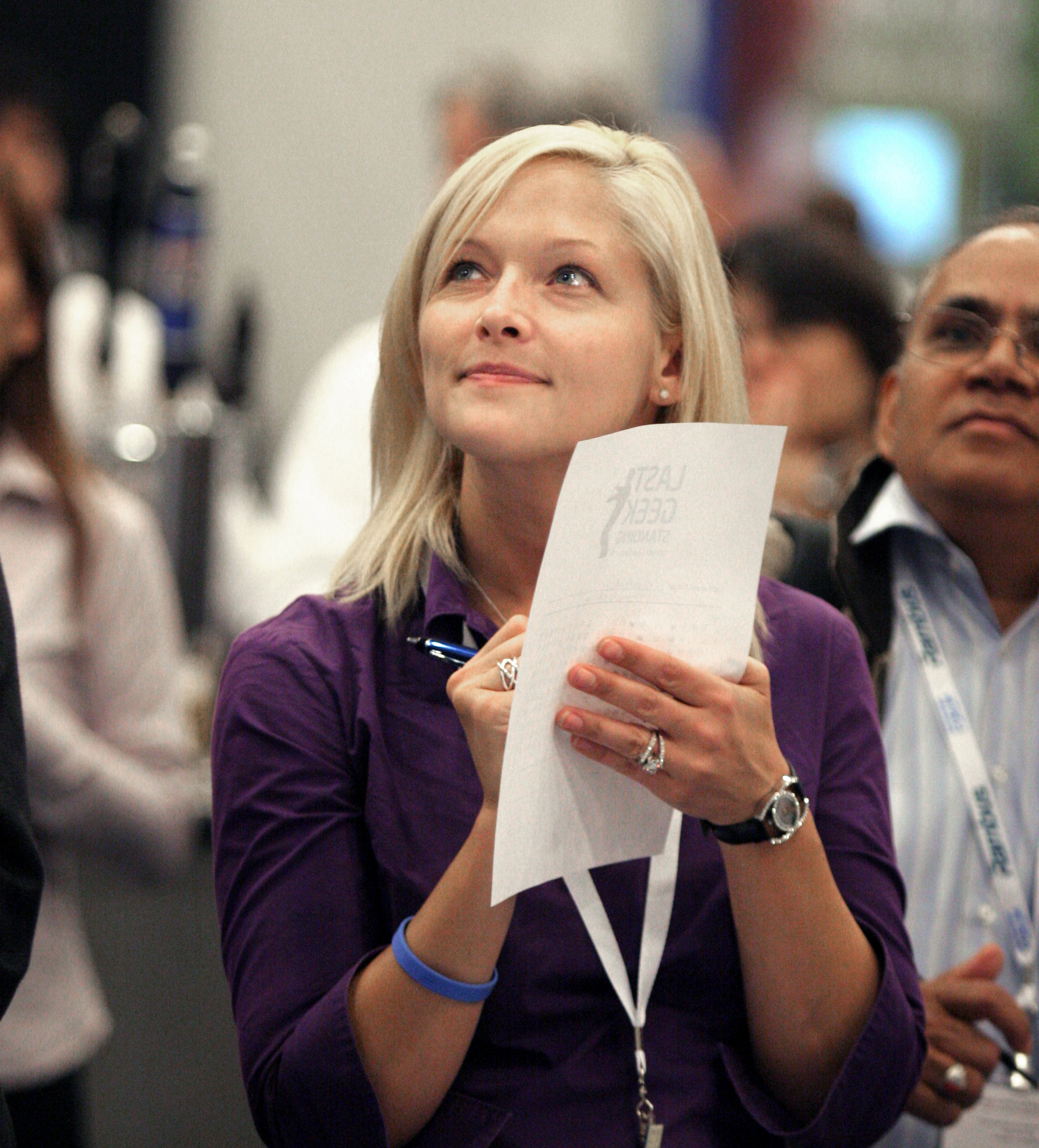 Intel’s Holly McAlpine looks at one of the forty questions asked during the Ultimate Geek Contest III, Last Geek Standing, held at the Intel Developer Forum at the Moscone West in San Francisco, Calif., on Tuesday, March 7, 2006. IDF attendees battle head–to–head against their fellow technologists to determine the smartest, fastest, most creative IDF geek. |