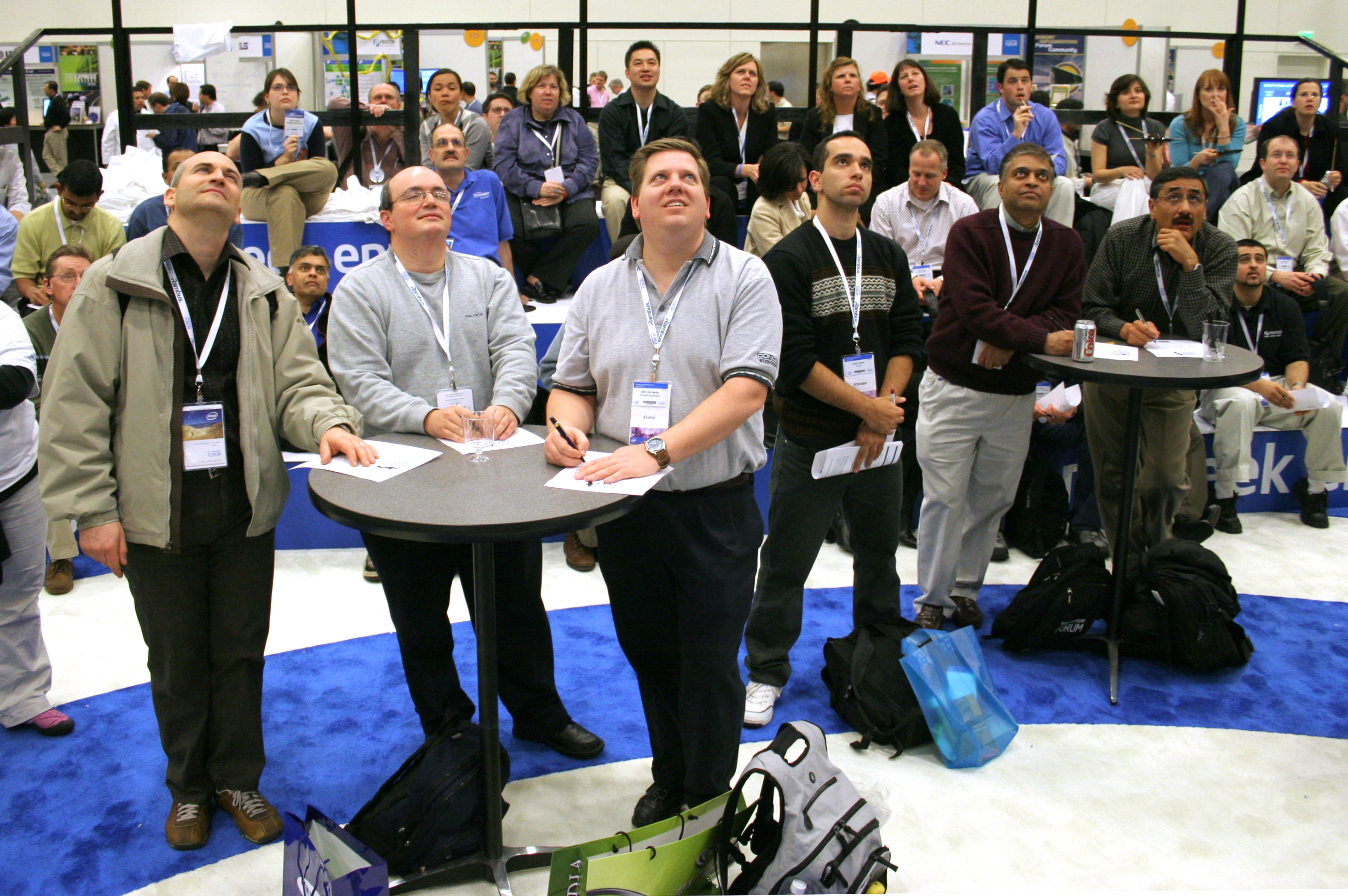 Contestants look at one of the forty questions asked during the Ultimate Geek Contest III, Last Geek Standing, held at the Intel Developer Forum at the Moscone West in San Francisco, Calif., on Tuesday, March 7, 2006. IDF attendees battle head–to–head against their fellow technologists to determine the smartest, fastest, most creative IDF geek. |