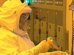 An Intel manufacturing technician, shown here, uses a scanner to start the very first 45 nm production lot of 300 mm wafers inside of Fab 32 Intel's first high-volume 45nm chip factory in Chandler, Ariz. The new factory will produce millions of Intel's new 45nm high-k metal gate microprocessors, the first of which are scheduled to launch on Nov. 12.
