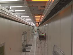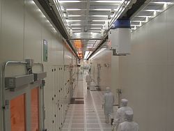 Technicians and engineers walk down the long hallways of Fab 32, Intel's first high-volume 45nm chip factory in Chandler, Ariz. The new facility includes 184,000 square feet of clean room space, which is approximately equal to the size of three U.S. football fields, and will make millions of Intel's 45nm high-k metal gate processors.