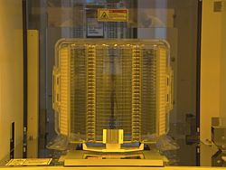 The front opening unified pod (or "FOUP") like the one shown here is used to transport the first 45nm production lot of 300 mm wafers through Fab 32, Intel's first high-volume 45nm chip factory in Chandler, Ariz.