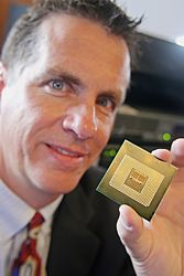 Tom Kilroy, vice president and general manager of Intel Corporation's Digital Enterprise Group, displays Intel's new Quad-Core Xeon 7300 series processor, September 5, 2007, at a news conference in San Francisco. Designed for multi-processor enterprise servers, the new 7300 processors can deliver up to twice the performance and more than three times the performance per watt over the company's previous generation dual-core products. (Photo for Intel by Court Mast, Mast Photography, Inc., San Francisco)