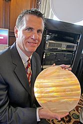 Tom Kilroy, vice president and general manager of Intel Corporation's Digital Enterprise Group, displays a wafer containing hundreds of Intel's new Quad-Core Xeon 7300 series processors, September 5, 2007, at a news conference in San Francisco. Designed for multi-processor enterprise servers, the new 7300 processors can deliver up to twice the performance and more than three times the performance per watt over the company's previous generation dual-core products. (Photo for Intel by Court Mast, Mast Photography, Inc., San Francisco)
